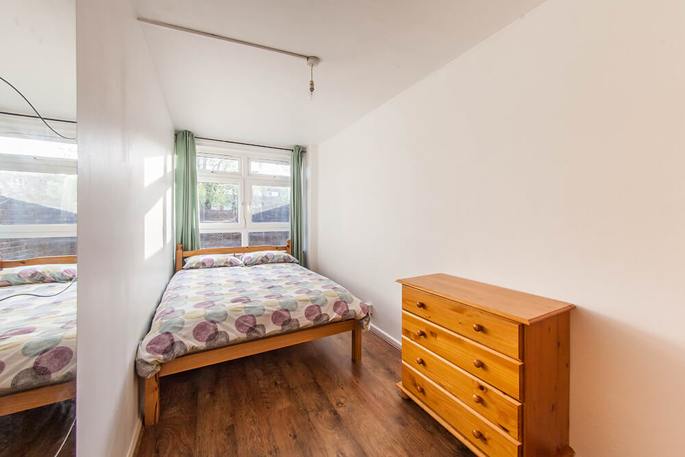 Este quarto duplo possui duas camas de solteiro, dois armários e uma cômoda e é ideal para estudantes ou profissionais que preferem gastar menos e compartilhar o quarto durante a sua estadia na capital da Inglaterra. Esta casa de 5 quartos possui uma boa estrutura, equipada e bem localizada.